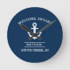 Navy Blue Welcome Aboard Custom Monogram Name Round Clock