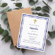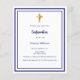 A white background, decorated with a navy blue frame, and a golden cross Personalise and add the name and details. Navy blue text.