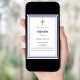 A white background, decorated with a navy blue frame, and a golden cross Personalise and add the name and details. Blue text.