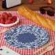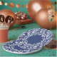 White Damask floral swirls dinner paper plates on a navy blue background.