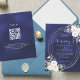 A blue, uneven coloured background. An oval faux silver frame decorated with watercolored white florals, roses. Personalise and add your names, details. White text.