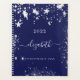 A navy blue background decorated with white stars and faux silver glitter dust. Personalize and add your name. The name is written with a modern hand lettered style script with swashes.