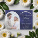 A navy blue background, photo arch wedding invitation. The blue background i uneven. White text.