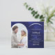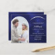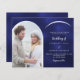 A navy blue background, photo arch wedding invitation. The blue background i uneven. White text.