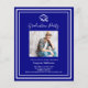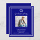 A navy blue background, decorated with a white frame, and a graduation cap. Personalise and add a photo name and details. White text.
