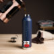 White text printed on a navy blue bottle. Personalise and add your name and a profile photo.