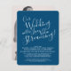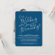 Simple modern wedding live video steaming invitations with your own photo on the reverse. Simple contemporary script text blue and white design. Personalise with your own wedding streaming details, brides and grooms names and details to watch and take part from a distance. Matching mono script text wedding products and other colour options are available in the store. © Original design by www.mylittleedenweddings.com