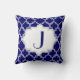 Navy blue, white quatrefoil pattern girly throw/toss accent decorative pillow or cushion with modern Moroccan lattice trellis pattern with monogram in a grey frame.