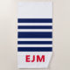 Navy Blue White Stripe Personalised Red Monogram Beach Towel