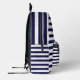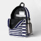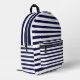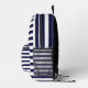 Navy Blue White Stripes Printed Backpack designed by Nisha Prabhu. Set sail on a voyage of style with our Navy White Stripes Printed Backpack. This backpack is a timeless classic, featuring a captivating pattern of navy blue and white stripes that evoke a sense of nautical adventure. It's a perfect blend of sophistication and practicality, designed to accompany you on all your everyday journeys. Whether you're headed to work, school, or a weekend getaway, this backpack is a reliable companion with its spacious compartments and durable construction. The navy blue and white stripes add a touch of elegance and versatility to any outfit, making it a versatile and stylish choice for all occasions. Embrace the allure of the open sea with our Navy Blue White Stripes Printed Backpack and make a fashion statement that never goes out of style.