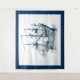 Elegant navy-blue vintage wind-sailing nautical boat illustration on white. Blue optional border.