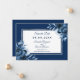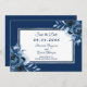 An elegant Save the Date card for a boho bohemian style wedding. A faux silver, navy blue and white frame with watercolored flowers, roses in shades of blue. Templates for your names, date and place of the wedding. A chic navy blue background on front, blue text.
