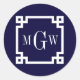 Navy Blue Wht Greek Key #2 Framed 3 Init Monogram Classic Round Sticker
