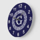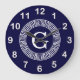 Navy Blue Wht Greek Key Rnd Frame Initial Monogram Large Clock