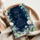 Romantic navy blue background framed with watercolor wildflowers in soft white and green tones. A timeless botanical style perfect for an elegant countryside celebration.