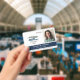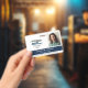 Horizontal employee ID badge personalised with photo and logo, name and title, and badge number and expiration date. Add name and title in white o navy blue.