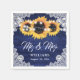 Rustic navy blue and sunflower wedding paper napkins featuring sunflowers, string lights and delicate floral lace on a rustic wood background.