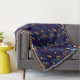 Navy blue woven blanket with a colorful pattern of pencils and rulers in yellow, blue, and red. Displayed in horizontal and vertical orientations.