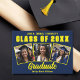 This modern navy blue and yellow custom senior graduation announcement photo collage card features your high school or college portrait pictures for the class of 2025. Customise with your graduating year under the bold handwritten script and grad cap for a great personalised graduate announcement.