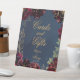 A navy blue and burgundy jewel tone "Cards & Gifts," wedding self-standing pedestal sign featuring a symphony of deep bordeaux, raspberry and burgundy red peonies embellished with gold spray and shimmering gold outlines gather around a navy blue watercolor-wash background with your names and numeric wedding date.