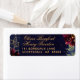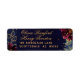 A burgundy navy wedding invitation return address label featuring a symphony of deep bordeaux red peonies adorned with gold spray and shimmering gold outlines gather around a navy blue watercolor wash background with your names large in gold rustic script with an uppercase non serif font announcing your details.