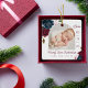 New baby birth stats photo Christmas ornament. The design features two photos, one photo on the front and one on the back. Display your new baby's photo. The date of birth is displayed along the side and the baby's name and birth stats along the bottom. Beautiful bold floral arrangements with deep burgundy, rich navy blue, and blush pink flowers with accents of lush green sage leaves and greenery. Florals are arranged in beautiful bouquet arrangements to create this bold and elegant floral design. Watercolor florals painted by Moodthology.