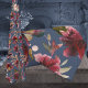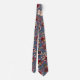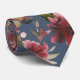 A burgundy wedding neck tie featuring watercolor-painted raspberry pink, red burgundy peonies with deep green, pink and peach greenery against a solid dusty navy blue background.
