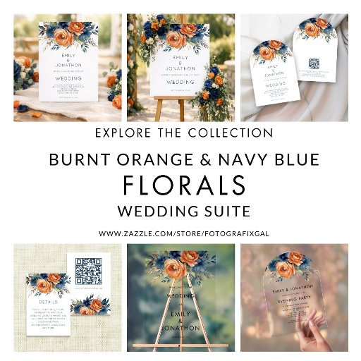Navy Burnt Orange Florals Wedding Details. Rustic florals and modern simplistic text with a QR code for your guests to scan to visit your wedding website. Change the sample url to your website url for your code to be automatically generated.