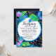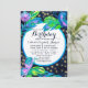 This is a majestic and artsy birthday party invitation for your special event. It depicts a hand-painted bright lime green, turquoise green, purple, neon pink, and neon yellow butterfly, flower, and tropical leaves arrangements around a circular blue watercolor border on top of a dark navy blue night sky. In the background are beautiful glowing yellow fireflies to light up and glow against the sky. It's elegant, modern, artistic, pretty, and unique!