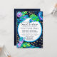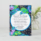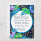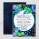 This is a majestic and artsy sweet sixteen birthday party invitation for your young teenage girl's special event. It depicts a hand-painted bright lime green, turquoise green, purple, neon pink, and neon yellow butterfly, flower, and tropical leaves arrangements around a circular blue watercolor border on top of a dark navy blue night sky. In the background are beautiful glowing yellow fireflies to light up and glow against the sky. It's elegant, modern, artistic, pretty, and unique!