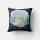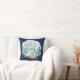 "Navy Camping Adventure Forest Baby Boy Birth Stats Throw Pillow." Dark navy stained wood background with watercolor woodland, forest animals of an owl, deer, bear, racoon and hedgehog are camping in the mountains. The message, "Let the adventure begin" in grey, textured typography and is combined with your baby boy's name, date, time, weight and length personalised. Art painted in watercolor by internationally licensed artist and designer, Audrey Jeanne Roberts, copyright