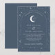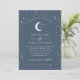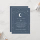 A celestial moon and star themed wedding invitation with a navy grey background and white text with elements. Customise the colour of the star pattern, background, arch fill and moon element!