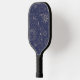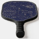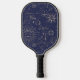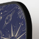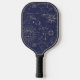 Pickleball paddle features hand drawn celestial and astronomical designs including suns, planets and stars on dark navy background