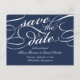 Elegant save the date postcards in classic navy blue and white feature embellished calligraphy script lettering for a classic, formal look. Personalize the reverse side with your wedding details, including names, date, location, and additional information like your wedding website. Space provided for your pre-printed return address.