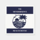Add a touch of coastal charm to your gathering with these personalised family beach house paper napkins. This chic design features a palm tree and the sun rising above the ocean in elegant navy blue and white, set against a crisp white background. Perfect for a beach housewarming celebration, seaside get-together, or beach party, these stylish coastal napkins can be personalised with your family name to make your event feel extra special. A beautiful blend of seaside simplicity and sophisticated style for your beach home entertaining.