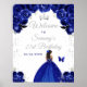 This elegant and glamourous birthday party welcome sign features a beautiful princess with dark skin in a navy blue ball gown. The text combines handwritten script and modern sans serif fonts for a classy and sophisticated look. The floral arrangements, butterfly and gold confetti create the perfect blend of rustic and chic.