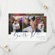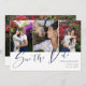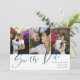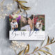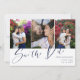 Double sided save the date card with three photos in a clean collage on one side and a larger photo on the other. Save the Date is written in a looser calligraphy style in navy blue on white. Add your names and wedding information. On the back, you can add your wedding website too.