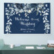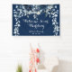 A navy and dusty blue watercolor floral Welcome To Our Wedding banner sign welcoming your guests to your wedding against a navy blue background with white calligraphy script and numerical date.