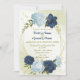 Beautiful wedding invitation featuring navy and dusty blue flowers and green leaves on an elegant gold geometric frame.