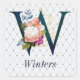 Vintage patterned background, large navy monogram letter W and beautiful floral embellishments. Personalise with name