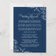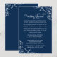 Create a polished and timeless look for your rehearsal evening with this navy wedding rehearsal dinner invitation. White scrollwork flourishes and refined calligraphy frame a charming rhyming poem that walks guests through the ceremony practice and dinner to follow. The classic navy background pairs perfectly with the crisp white accents. Every detail is fully editable to match your wedding style.