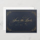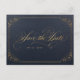 Elegant handwriting calligraphy script with flourish frame in navy blue and faux gold colour, clean and formal, great wedding save the date postcards for vintage wedding, traditional wedding, and classic wedding all year round.