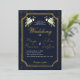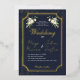 Invite your guests with this stunning and luxurious wedding invitation, designed to impress from front to back. The front features your essential wedding details on a rich navy blue background with a dramatic scattered gold glitter effect, framed by an ornate gold border and elegant white rose floral accents. The key text uses a beautiful gold script font for an opulent touch.