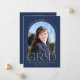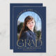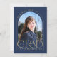 This navy blue and gold simple minimalist arch graduation announcement features a delicate arch frame, 2 photo templates and elegant modern typography.