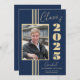 This Class of 2025 stylish college graduation announcement features gold stripes, photo frame, and text on a navy blue background.