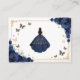 Navy, gold and white Quinceanera reception details enclosure cards. Features brunette girl in ball gown dress, script font, gold butterflies, roses and tiara. Perfect for an elegant princess style glam celebration. Personalize with your own details.