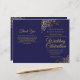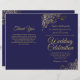 This combination wedding invitation and program features an elegant navy blue and gold design with delicate faux foil curls and swirls in the corners. The front features the invitation, while the inside has the ceremony and bridal party details. The back has space for a thank you note.