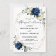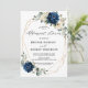 Dark navy blue floral rehearsal dinner Invitation featuring elegant bouquet of navy blue, royal blue , white , gold, champagne ivory, blush colour rose , hydrangea, ranunculus, peony, flower buds and sage green eucalyptus leaves and elegant watercolor with round glitter geometric neutral frame. Please contact me for any help in customisation or if you need any other product with this design.
