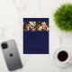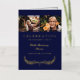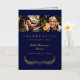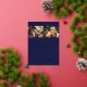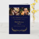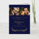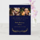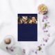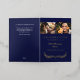 Folded navy and gold funeral program printed with two photos of your loved one, their name and years living, and obituary. The cover is navy blue with gold foil text and greenery.