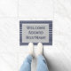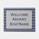 Perfectly chic, and classic navy and white with grey Welcome Aboard _________ doormat for your boat of marina slip customisable with your boats name